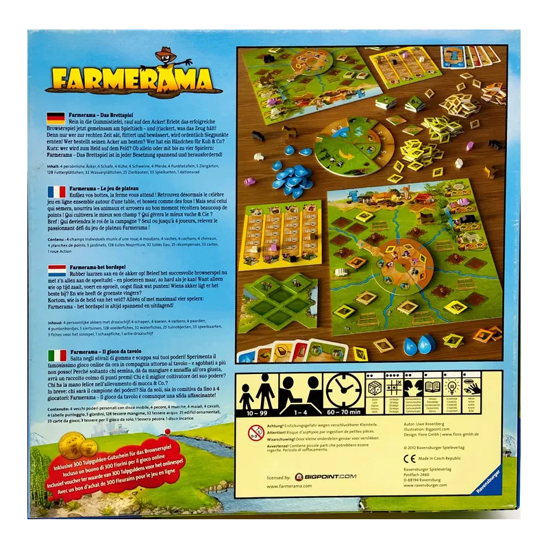 Farmerama - Das Brettspiel Rein in die Gummistiefel, rauf auf den Acker! Erlebt das erfolgreiche Browserspiel jetzt gemeinsam am Spieltisch - und (r)ackert, was das Zeug hält! Denn nur wer zur rechten Zeit sät, füttert und bewässert, wird ordentlich Siegpunkte ernten! Wer bestellt seinen Acker am besten? Wer hat ein Händchen für Kuh & Co? Kurz: wer wird zum Held auf dem Feld? Ob allein oder mit bis zu vier Spielern: Farmerama - Das Brettspiel ist in jeder Besetzung spannend und herausfordernd!