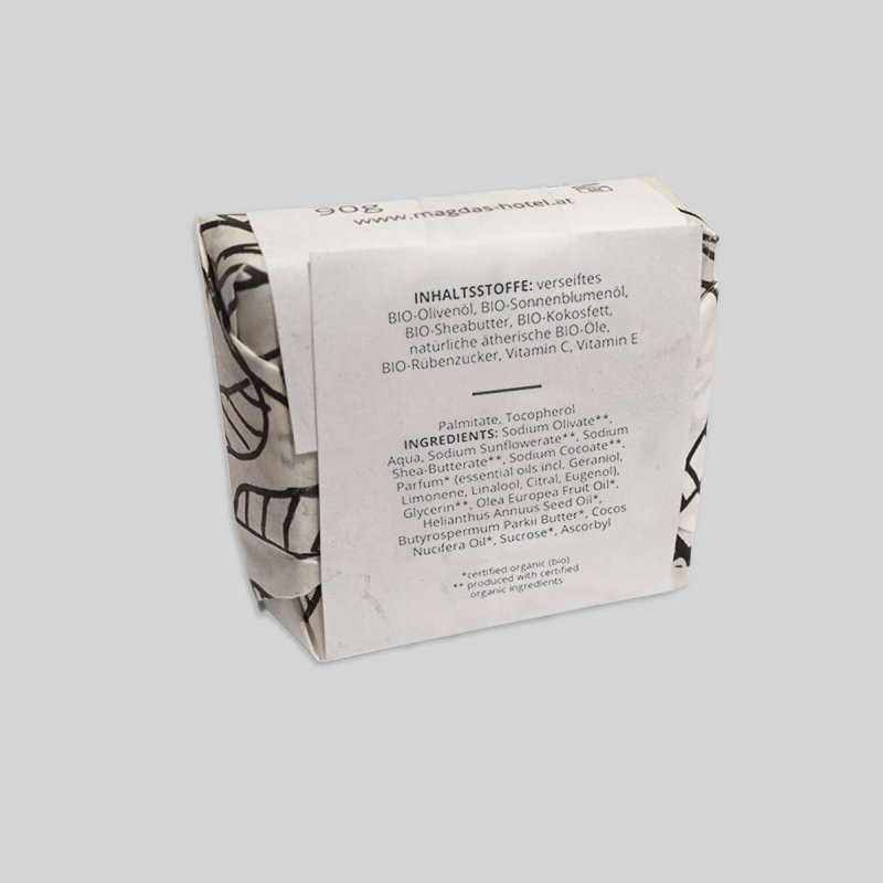 Stay open-minded and clean - unsere Bio-Seife ist ein duftendes Universalgenie. Sie reinigt und pflegt deine Hände sanft ohne auszutrocknen und hinterlässt eine zarte Bergamotte-Duftnote auf deiner Haut. Unsere Magdas-Seife aus verseiftem Bio-Olivenöl, Bio-Sonnenblumöl, Bio-Sheabutter, Bio-Kokosfett und natürlichen ätherischen Bio-Ölen wurde von Lederhaas Cosmetics eigens für uns kreiert, riecht fantastisch und ist bio-zertifiziert.